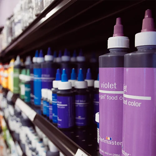 Violet edible food gel color bottles for cake decorating and fondant crafting on bakery store shelf.